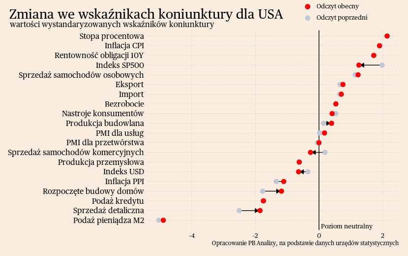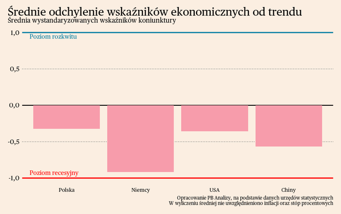 W każdym tygodniu aktualizujemy informacje o kondycji światowej gospodarki przez pryzmat 80 wskaźników z czterech gospodarek – Polski, Niemiec, Stanów Zjednoczonych i Chin. Wszystkie analizowane przez nas wskaźniki można obserwować i pobierać na naszej platformie danych PB Analizy. W analizie dane podajemy na wykresach w wystandaryzowanej mierze – jako odchylenie rocznej dynamiki od trendu, skorygowane o zmienność. Dzięki temu możemy porównywać dane o różnych cechach statystycznych.