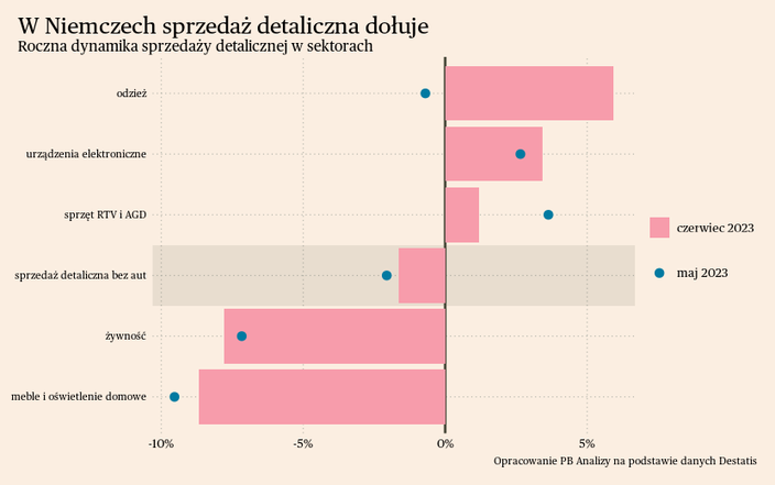 W gospodarce realnej wyrazem spowolnienia był kolejny słaby odczyt sprzedaży detalicznej. Sprzedaż obniżyła się w czerwcu o 1,6 proc. rok do roku. Najmocniej spada sprzedaż żywności, co może wynikać ze wzrostu cen i tym samym przesuwania zakupów konsumentów w kierunku tańszych dóbr (co powoduje efekt spadku wolumenu sprzedaży, gdyż towary o wyższej wadze w całości sprzedaży notują niższe dynamiki). Pozytywnym sygnałem może być wzrost sprzedaży dóbr trwałych – sprzętu elektronicznego, RTV i AGD. Możliwe, że konsumenci powoli zaczynają wracać do zakupów tego typu produktów. Natomiast istotnym źródłem wzrostu był efekt niskiej bazy sprzed roku. Ponadto sprzedaż w tych kategoriach charakteryzuje się dużą zmiennością, więc na razie trudno mówić o odwróceniu trendu.
