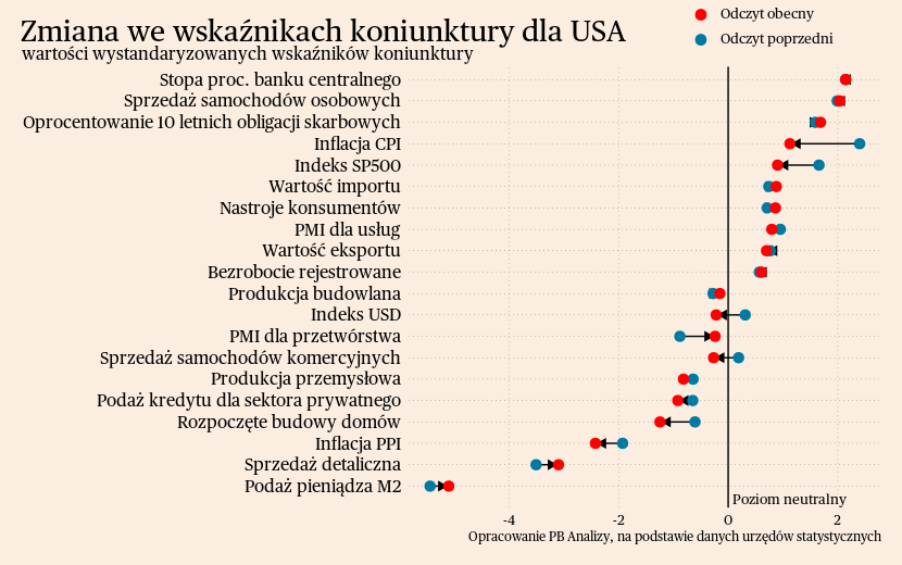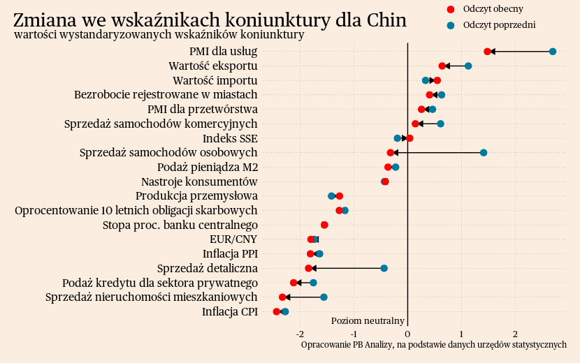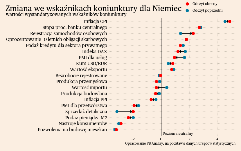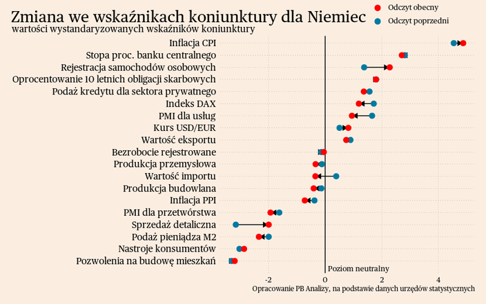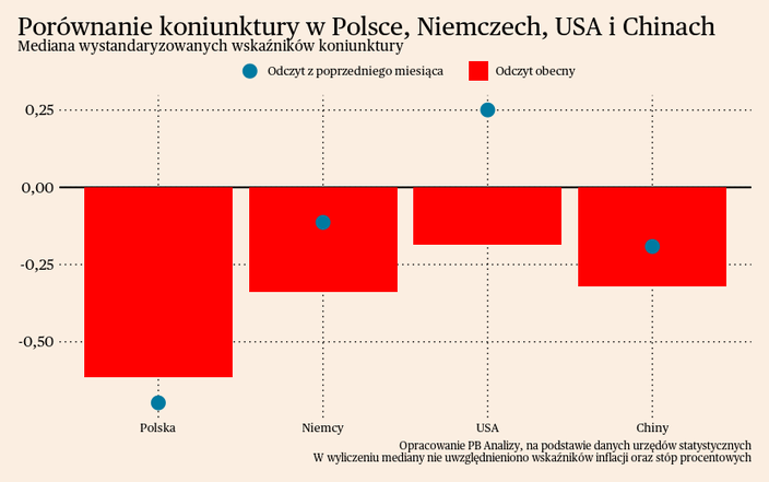 W każdym tygodniu aktualizujemy informację o kondycji światowej gospodarki przez pryzmat 80 wskaźników z czterech gospodarek – Polski, Niemiec, Stanów Zjednoczonych i Chin. Wszystkie analizowane przez nas wskaźniki można obserwować i pobierać na naszej platformie danych PB Analizy. W analizie dane podajemy w wystandaryzowanym odchyleniu od średniej historycznej. Dzięki temu możemy porównywać dane o różnych cechach statystycznych i pokazywać odchylenia od długookresowego trendu.