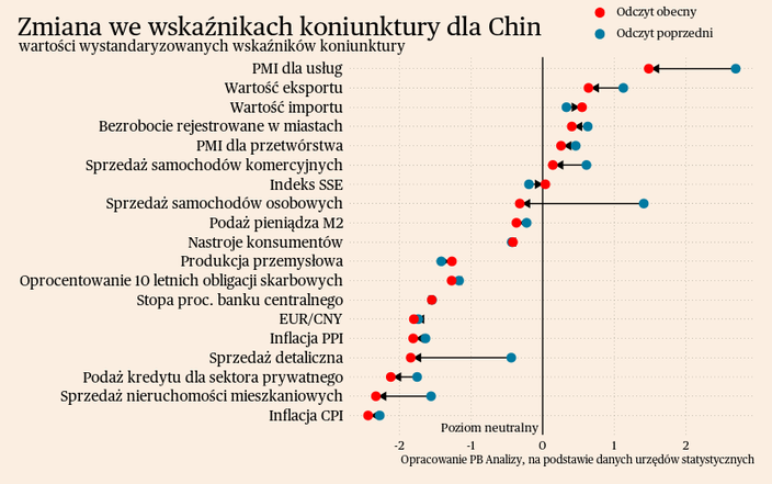 W Chinach utrzymuje się słaba koniunktura przemysłowa, co spójne jest ze światowymi trendami recesyjnymi w tym sektorze. Chiny są fabryką świata i muszą odczuwać niski popyt na towary. W chińskim przemyśle wskaźnik PMI spadł z 50,2 pkt. w czerwcu do 49,2 pkt. w lipcu. Od dłuższego czasu wskaźnik oscyluje wokół neutralnego poziomu 50 pkt. Przedsiębiorstwa trwają w letargu na obniżonym poziomie aktywności. Narzekają głównie na brak popytu zagranicznego oraz krajowego. Spadek popytu zagranicznego jest największy od września 2022 roku. Wynika to ze spowolnienia gospodarczego na Zachodzie oraz narastających napięć politycznych. Popyt krajowy jest obniżony przez załamanie na rynku nieruchomości oraz bardzo pesymistyczne oczekiwania ludności.