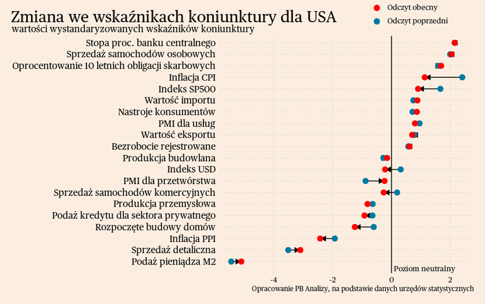 Mediana wskaźników wzrosła w Polsce, a obniżyła się w Niemczech, USA oraz Chinach. Generalnie dane makro lekko pogorszyły się w minionych dniach i tygodniach. Polska znajduje się w najniższej fazie cyklu koniunkturalnego, dlatego wskaźniki są w niej najniższe. W Niemczech wskaźniki wyraźnie spadły, a nastroje przedsiębiorstw wskazują, że dekoniunktura utrzyma się w następnych miesiącach. W Stanach Zjednoczonych hamowanie wskaźnika jest wyraźne, ale następuje z najwyższego poziomu. W Chinach uwypuklają się problemy strukturalne gospodarki, utrudniające odbudowę koniunktury. Pekin wie o ich istnieniu, ale dotychczas nie zapowiedział konkretnych działań naprawczych.