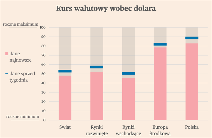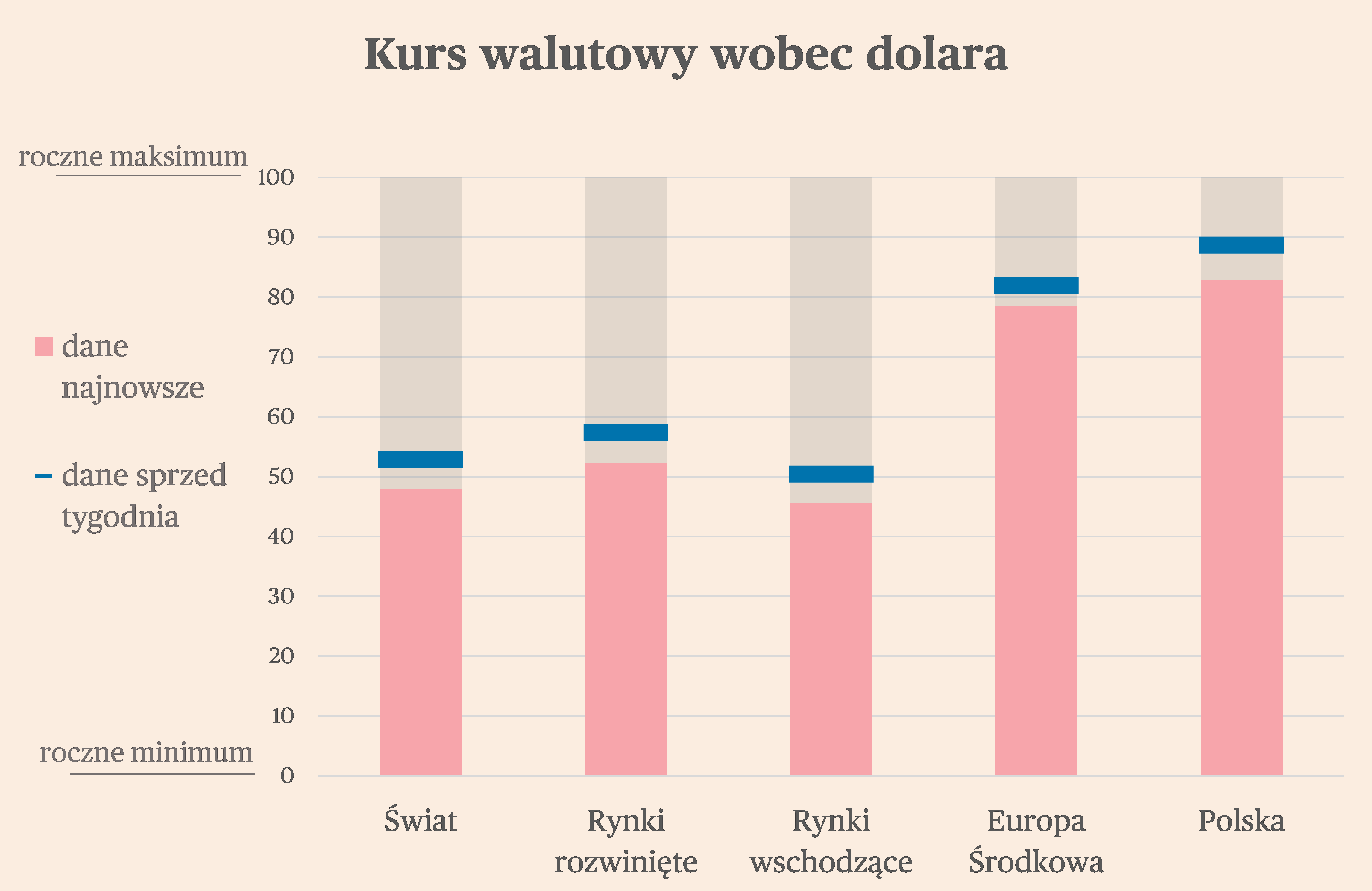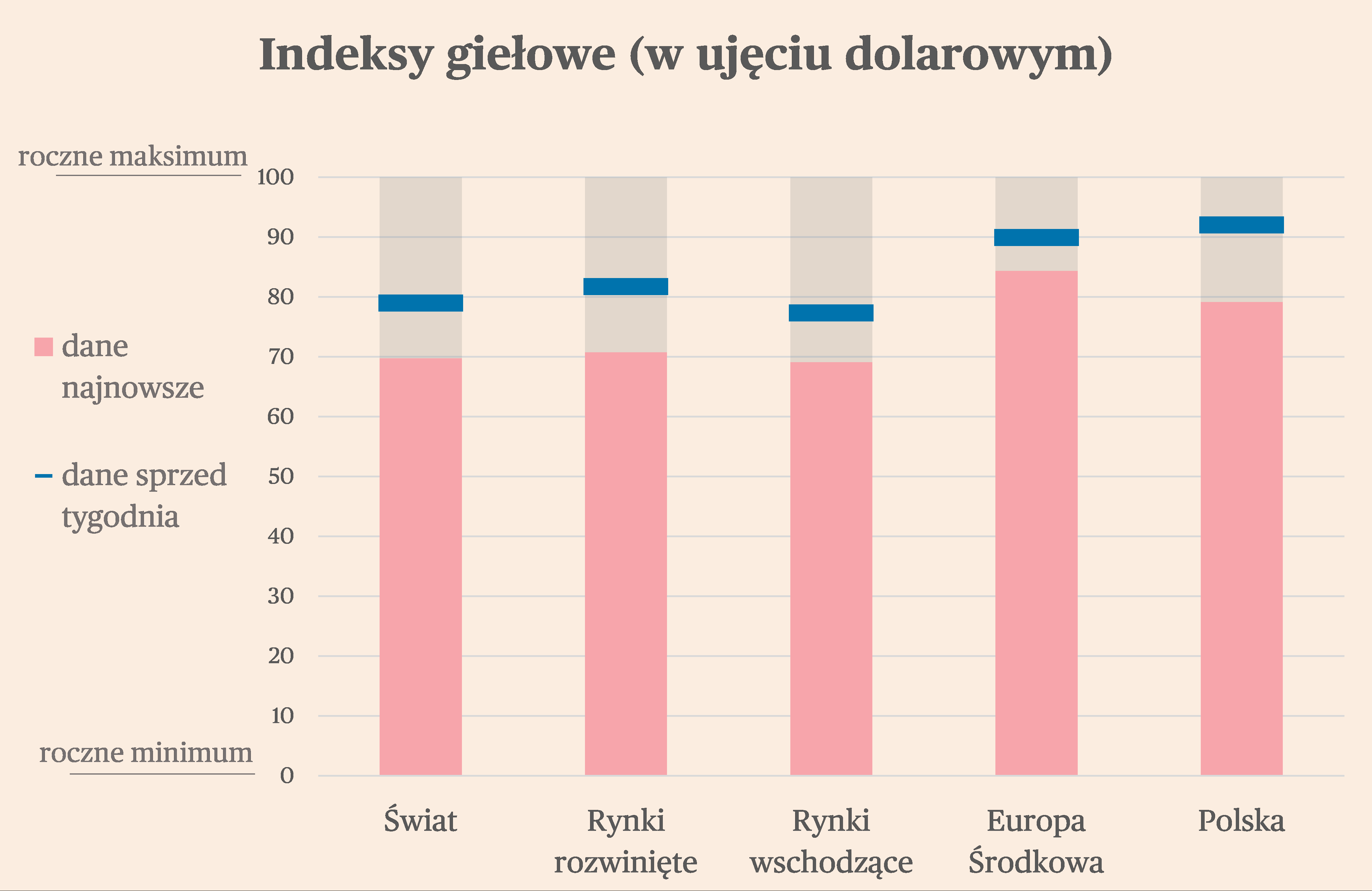 Indeksy giełdowe dość wyraźnie obniżały się w minionych dniach. Spośród 16 śledzonych przez nas indeksów, średnia zmiana notowań w walutach krajowych wynosiła -2,3 proc. Najwięcej traciły indeksy w Chinach, Polsce i Korei, co jest spójne z danymi o kursach walutowych. Kapitał odpływał z gospodarek opartych na przemyśle. Najwięcej uwagi przyciąga oczywiście sytuacja w Chinach, skąd inwestorzy wycofują się szeroką ławą Indeks Shanghai Composite spadł w ciągu tygodnia o ponad 5 proc. i znalazł się na najniższym poziomie od końca 2022 roku. Wszelkie sygnały powrotu optymizmu na chiński rynek, widoczne na przełomie lipca i sierpnia wyparowały. Natomiast patrząc szerzej na rynki światowe, warto zauważyć, że indeksy – nawet w przeliczeniu na dolary – wciąż znajdują się znacznie bliżej rocznego maksimum niż minimum (patrz wykres). Obecne przecena wygląda na razie na korektę, a nie początek bessy. Zmienić się to może jeżeli sygnały recesji w światowej gospodarce zaczną się wzmacniać.