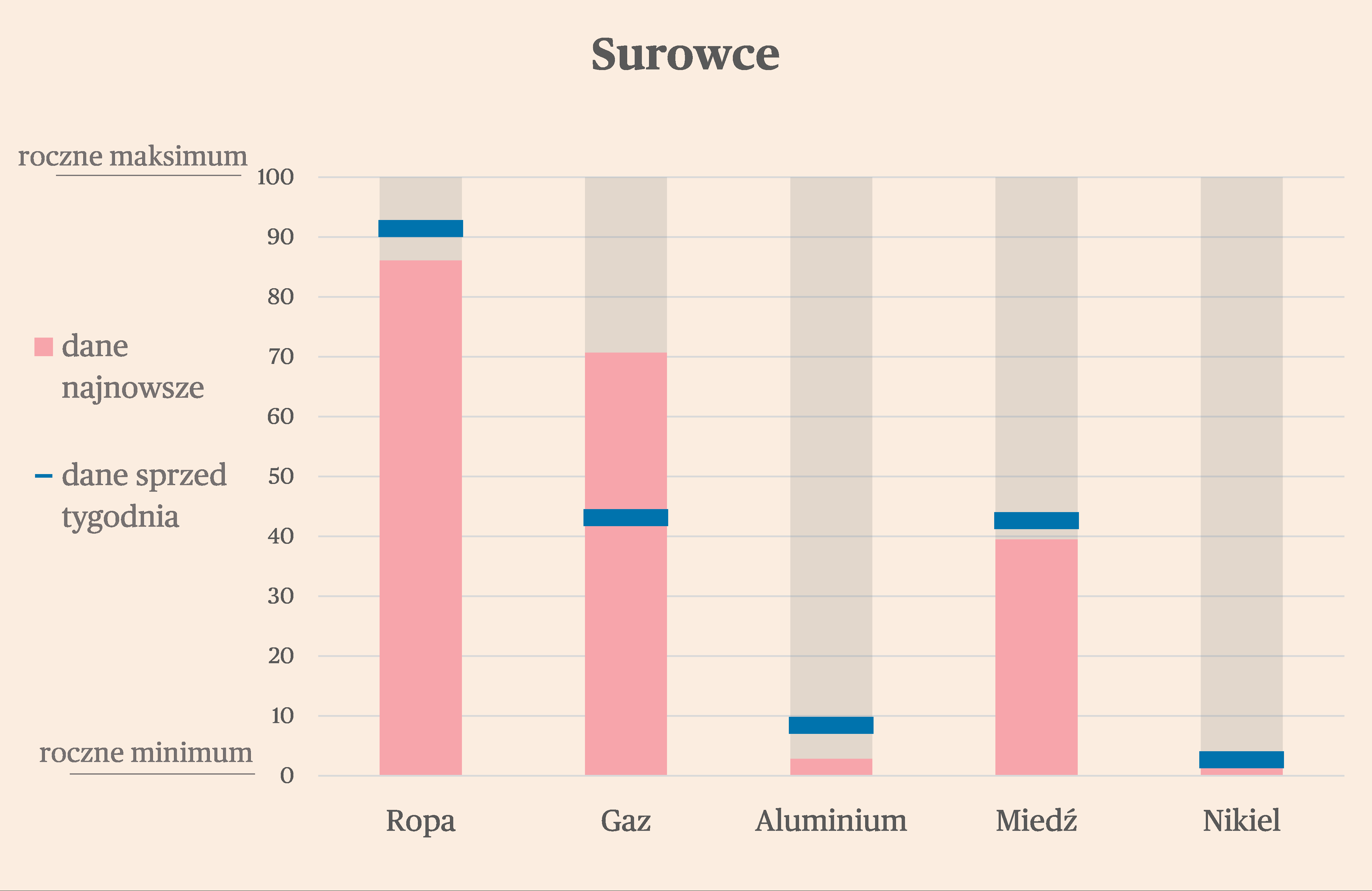 Na rynkach surowcowych również dominowały spadki cen, co wpisuje się w obraz recesji przemysłowej. W ciągu tygodnia ropa staniała o 2 proc., miedź o 1 proc., aluminium o 1,5 proc. Niskie notowania aluminium są odzwierciedleniem bardzo słabej koniunktury przemysłowej, ponieważ cena tego metalu jest najmocniej ze wszystkich skorelowana z dynamiką produkcji przemysłowej na świecie. Pozytywny dla światowej gospodarki jest natomiast fakt, że trend aprecjacyjny zatrzymały ceny ropy, które utrzymały się poniżej 90 dolarów za baryłkę (Brent).