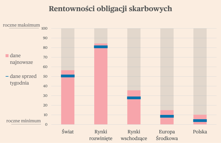 Na większości rynków rosły w ostatnich dniach rentowności obligacji skarbowych (co oznacza spadek ich cen). Rentowność 10-letnich papierów amerykańskich wzrosła o 0,1 pkt proc., niemieckich o 0,05 pkt proc., polskich o 0,15 pkt proc. Jest to element ruchu trwającego już od miesiąca. Wzrostowy trend rentowności trwa dokładnie od tego samego momentu, od którego zaczął się w lipcu umacniać dolar. To pokazuje, że ruch jest spowodowany przez sytuację w Stanach Zjednoczonych, gdzie mocne dane makroekonomiczne prowadzą do wzrostu rentowności, co przekłada się na większą presję na rentowności w innych krajach. Na razie jednak jest to zmiana relatywnie łagodna i nie widać, by miała na prowadzić do istotnych rewizji prognoz makroekonomicznych dla rynków wschodzących. Na przykład, w Polsce inwestorzy wciąż oczekują spadku inflacji i obniżenia stóp procentowych.
