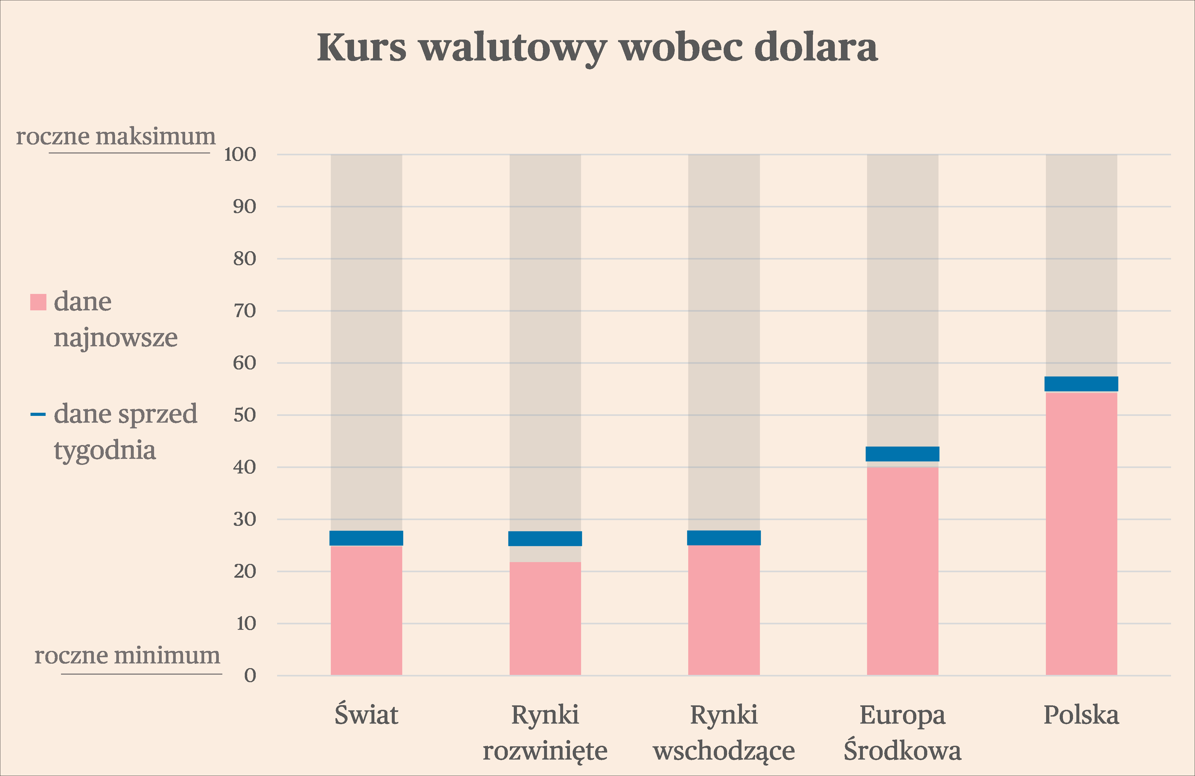 Na rynkach walutowych doszło do umocnienia dolara, związanego ze wzrostem awersji do ryzyka. Ale nie był to mocny ruch. Spośród 17 śledzonych przez nas walut, 10 osłabiało się wobec dolara, a średnia zmiana kursu wynosiła -0,15 proc. Generalnie mocniej traciły waluty rynków rozwiniętych niż wschodzących. Najwięcej traciła szwedzka korona, bo aż 1,7 proc. Notowania szwedzkiej waluty są blisko rekordowo niskiego poziomu wobec dolara. Przyczyną jest recesja tamtejszej gospodarki. Według Riksbanku w tym roku szwedzki PKB ma spaść o 0,8 proc., a w przyszłym o 0,1 proc. Na to nakładają się obawy o kondycję sektora nieruchomości komercyjnych, który ma duży udział w aktywach szwedzkiego sektora bankowego. A słabość korony wspiera też wysoka cykliczność tej waluty. W banku centralnym i wśród ekonomistów rynkowych panuje mocne przekonanie, że ta waluta jest niedowartościowana, ale trend deprecjacyjny jest tak silny, że trudno podejmować się odważnych predykcji dotyczących ewentualnego umocnienia korony. Natomiast najwięcej wobec dolara w minionych dniach zyskiwał brazylijski real i południowoafrykański rand. W obu przypadkach był to mocny ruch w ramach dotychczasowego zakresu wahań. Ale warto zauważyć, że z krótkookresowej perspektywy ewidentnie widać większy apetyt inwestorów na nabywanie aktywów rynków wschodzących niż rozwiniętych.