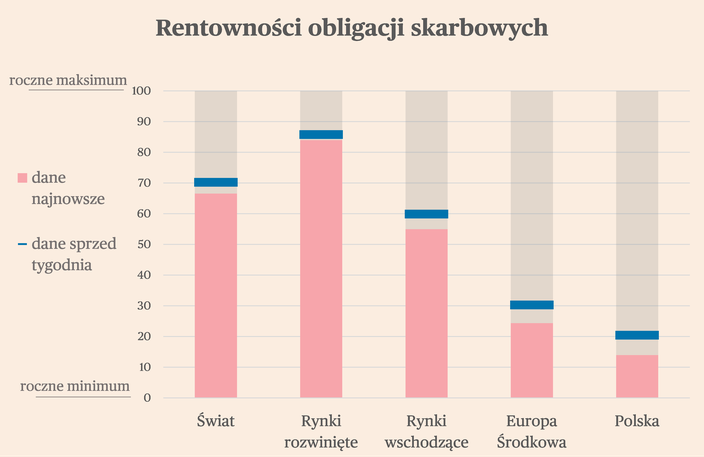 Rentowności obligacji skarbowych obniżały się w minionych dniach. Spośród 15 śledzonych przez nas rynków, rentowności papierów dziesięcioletnich obniżyły się na 12, a średni spadek wyniósł 0,05 pkt proc. (5 pkt bazowych). Impulsem do wzmożonego zakupu obligacji było przekroczenie przez rentowności amerykańskich papierów psychologicznej granicy 5 proc. Najwyraźniej wtedy duża część inwestorów uznała, że nadszedł czas na większe zaangażowanie w obligacje, co doprowadziło do wzrostu cen i tym samym spadku rentowności. Choć trudno jeszcze mówić o trendzie spadkowym, to wydaje się, że szczyt rentowności możemy mieć za sobą.
