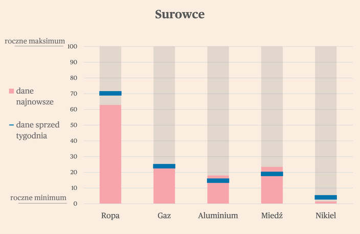 Na rynku surowcowym najważniejszym wydarzeniem był spadek cen ropy, pomimo stopniowego zaostrzenia wojny w Izraelu i wzrostu ryzyka rozlania konfliktu na cały region. W ciągu tygodnia baryłka ropy Brent obniżyła się o ponad 2 proc. Nie jest to zapewne początek jakiegoś trwałego spadku, ale sam fakt, że cena jest dość stabilna w warunkach dużego ryzyka geopolitycznego świadczy o słabości popytu na surowiec. Obecnie zapotrzebowanie na ropę na świecie rośnie w tempie ok. 1 proc. rok do roku (dane U.S. Energy Information Administration), czyli nieco wolniej niż obserwowane w pierwszym półroczu 2 proc. Ale jednocześnie produkcja ropy znajduje się w stagnacji. Dlatego głębszy spadek cen raczej nie nastąpi. Na rynkach metali nastroje były zróżnicowane, drożały miedź i aluminium, a taniał nikiel. Na razie nie widać nowych trendów. Wzrost cen miedzi nie wykracza poza zakres wahań z poprzednich tygodni. Ceny są wciąż ok. 5 proc. niższe niż latem, co świadczy o rozczarowującym popycie ze strony sektora przemysłowego na świecie.