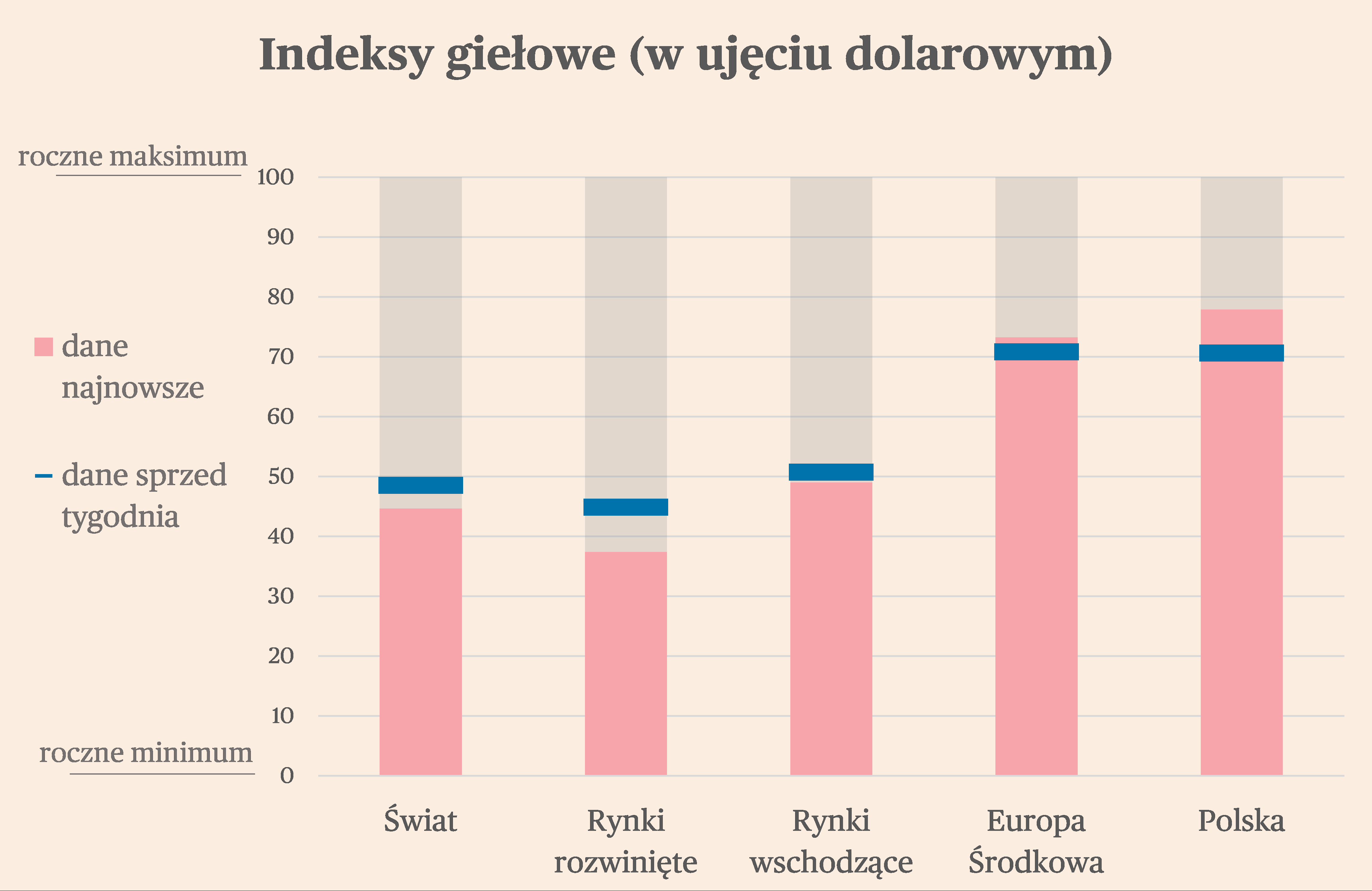 Na rynkach giełdowych nastroje były niedobre, choć nie paniczne. Spośród 16 śledzonych przez nas indeksów, 10 w ostatnich pięciu dniach traciło. Średnia zmiana w walutach lokalnych wyniosła tylko -0,3 proc., czyli niewiele. I podobnie jak w przypadku walut, widać lepsze zachowanie indeksów rynków wschodzących niż rynków rozwiniętych. Najwięcej traciły indeksy w Korei, USA, Wielkiej Brytanii i Szwecji. Spadki na razie wyglądają na korektę, a układ cen aktywów wskazuje, że głównym ich źródłem są obawy o kondycję makroekonomiczną światowej gospodarki, bowiem jednocześnie spadają akcje, surowce i rentowności obligacji. Z kolei najlepiej prezentował się warszawski WIG20, w czym widać efekt wyborów parlamentarnych. Następuje rewaluacja polskich aktywów, w nadziei na zmianę w relacjach między Polską a Unią Europejską.