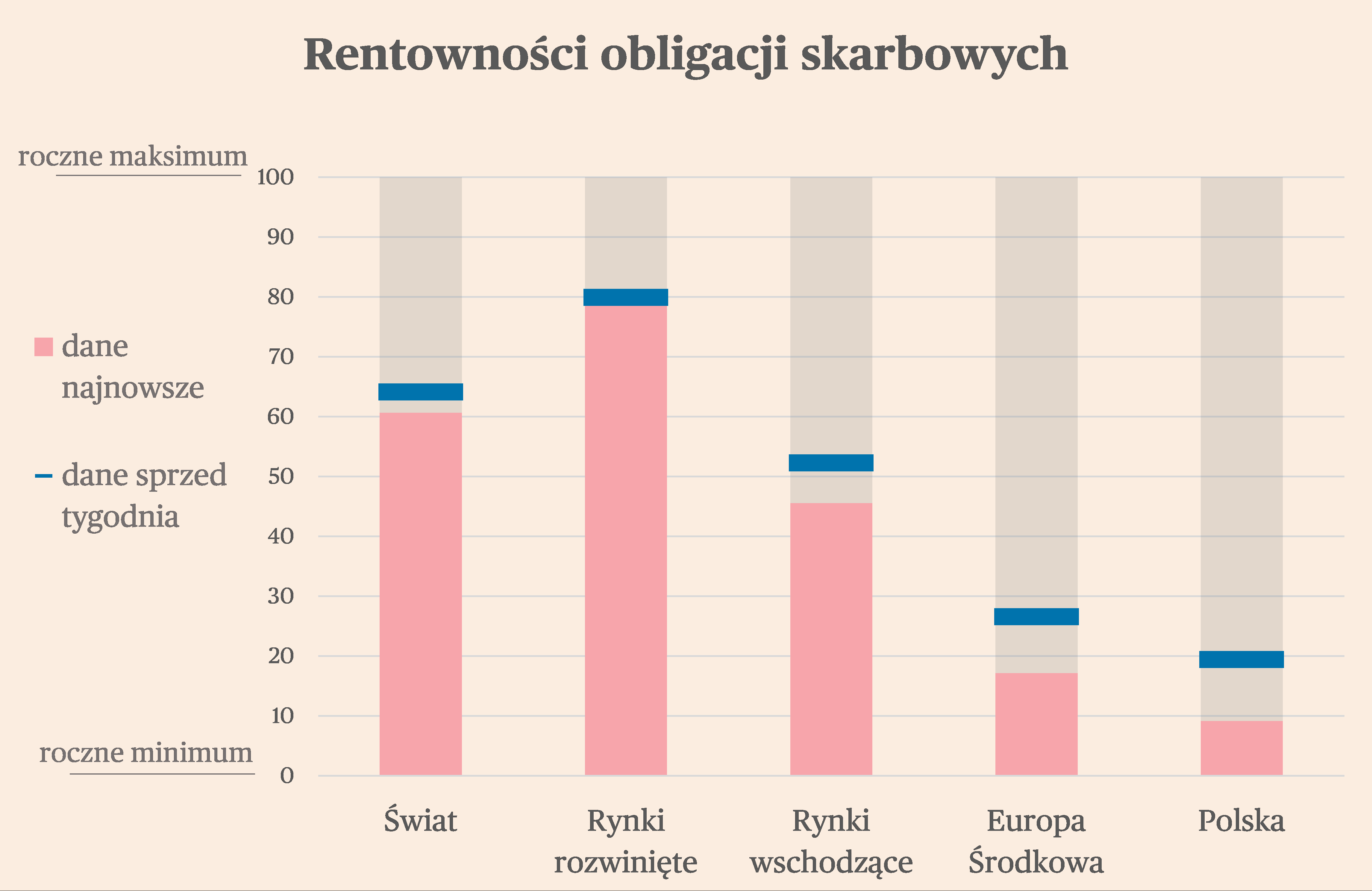 Rentowności obligacji obniżały się w minionych pięciu dniach, a szczególnie wyraźny był to ruch na rynkach wschodzących. Tutaj może kryć się klucz do zrozumienia spokojnych nastrojów na giełdach. Inwestorzy wciąż są przekonani o silnej dezinflacji, szczególnie w krajach, które doświadczały największych fal inflacji. Na przykład, w ostatnich tygodniach wyraźnie obniżyły się rentowności w Czechach, ponieważ inflacja w tym kraju spada w szybkim tempie, co otwiera drzwi do obniżek stóp procentowych. Natomiast trzeba też zauważyć, że ostatni wzrost cen ropy powoduje już wzrost inflacji w wielu krajach i negatywną reakcję cen obligacji. Ruch stóp w dół nie jest powszechny.
