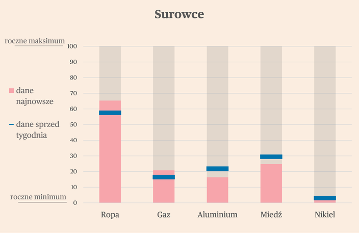 Na rynkach surowcowych kontynuowana jest dywergencja między cenami surowców energetycznych, a cenami metali. Ropa i gaz drożeją z powodu konfliktu na Bliskim Wschodzie. Izrael szykuje się do pełnowymiarowej inwazji na Strefę Gazy, a Iran grozi zaangażowaniem w konflikt. Na horyzoncie pojawia się więc ryzyko konfliktu Iranu ze Stanami Zjednoczonymi. Jednocześnie wzrosty cen nie są bardzo silne. W ciągu tygodnia ropa zdrożała o 2 proc. i jest jednocześnie ok. 5 proc. droższa niż przed dniem zamachu terrorystycznego w Izraelu. Natomiast ceny metali się obniżają. W minionym tygodniu taniały miedź, aluminium i nikiel. Te dwa pierwsze metale są silnie powiązane z cyklem przemysłowym, więc ich niskie notowania wskazują na to, że w przemyśle światowym wciąż utrzymuje się dekoniunktura.