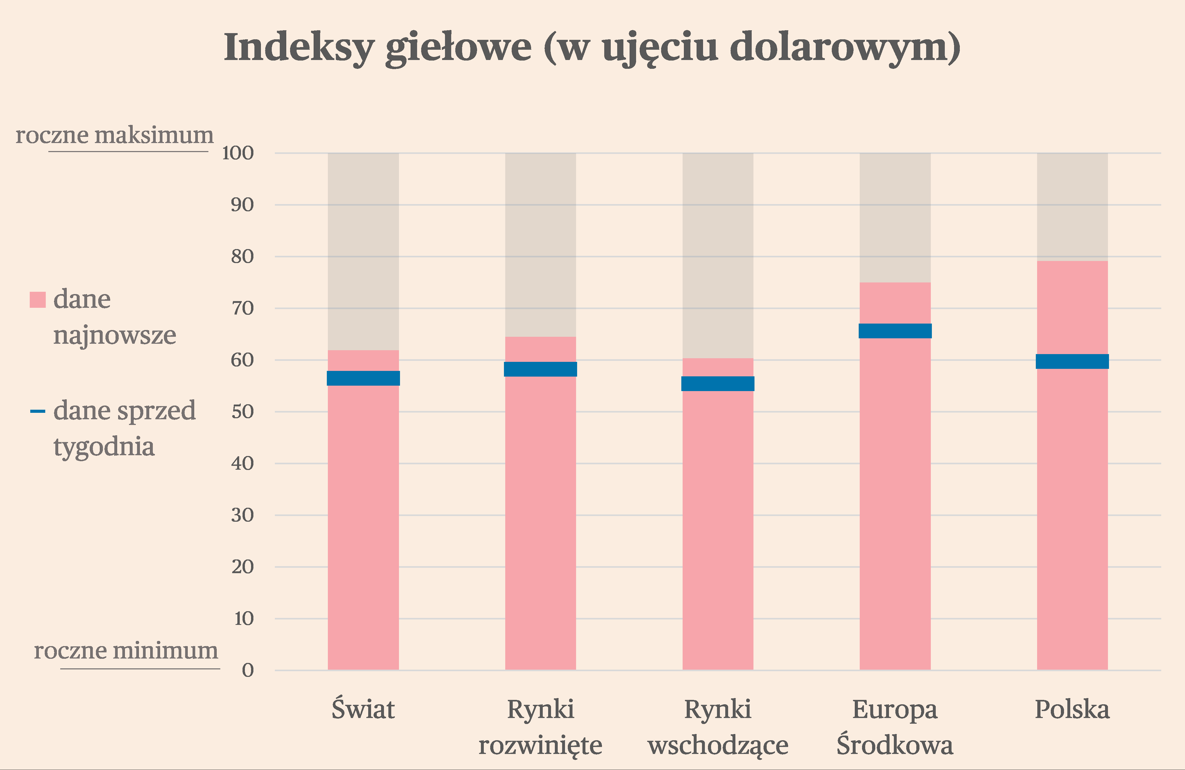 Na rynkach giełdowych utrzymuje się wysoki apetyt na ryzyko. Spośród 16 śledzonych przez nas indeksów, aż 15 w ostatnich pięciu dniach zyskiwało. Średnia zmiana w walutach lokalnych wyniosła 1,6 proc., czyli więcej niż tydzień wcześniej. Fakt, że dzieje się to w warunkach rosnących cen ropy i spadających cen metali (czyli energia jest droższa, a perspektywy popytu najwyraźniej słabe) można uznać za zaskakujący. Ale wiele wskazuje też na to, że rynki są obecnie mniej wrażliwe na wstrząsy makroekonomiczne, dopóki nie przyjmują one gwałtownego charakteru. Najwięcej zyskały polskie akcje, co związane jest z wynikiem wyborów parlamentarnych i możliwą zmianą rządu. Wśród innych indeksów nie było takich, które by się wyróżniały szczególnie mocno.