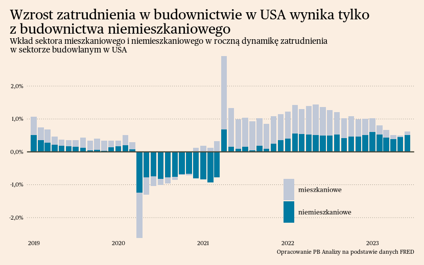 Boom inwestycyjny ujawnia się także na rynku pracy, gdzie rośnie znaczenie sektora niemieszkaniowego w zatrudnieniu w budownictwie. Od początku cyklu zacieśniania polityki pieniężnej spada dynamika wzrostu zatrudnienia w budownictwie mieszkaniowym, natomiast w budownictwie niemieszkaniowym zatrudnienie nadal rośnie. Statystyka obejmuje nie tylko przedsiębiorstwa powiązane z produkcją sprzętu elektronicznego, jednak jak było widać na wcześniejszym wykresie, to właśnie w tym obszarze najmocniej przybywa inwestycji.