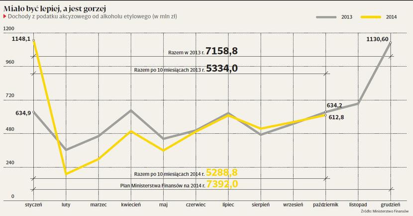 Żeby zrealizować tegoroczny plan, resort finansów musiałby dostać wyjątkowo drogi prezent pod choinkę od producentów mocnych alkoholi. Po dziesięciu miesiącach wpływy z akcyzy na alkohol etylowy są o 45 mln zł niższe niż w tym samym okresie rok wcześniej, choć w ciągu całego 2014 r. powinny być o 780 mln zł wyższe niż w 2012 r., co oznacza, że w listopadzie i grudniu branża powinna wpłacić do kasy państwa 2,1 mld zł. Przed rokiem w tym okresie wpłaciła 1,8 mld zł, ale to wynik nie do powtórzenia.