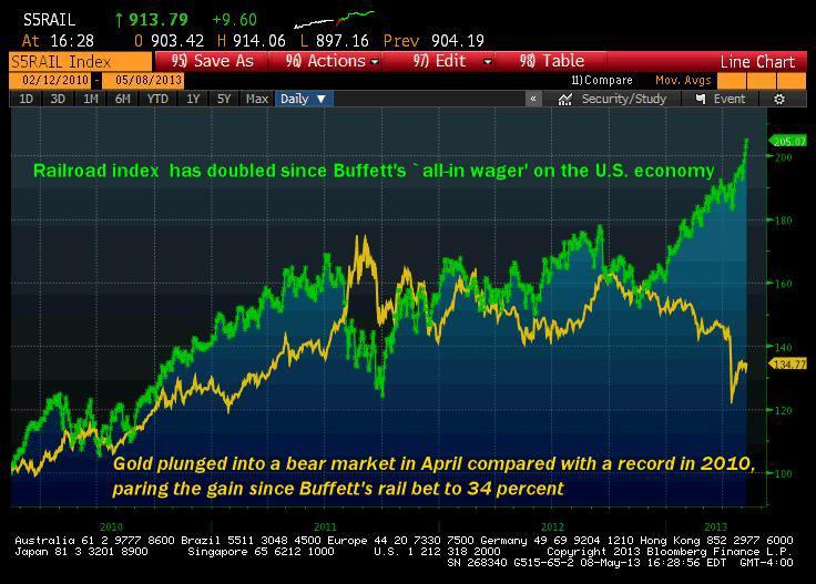 Inwestycja w linie kolejowe Burlington Northern Santa Fe, którą Warren Buffett nazwał zakładem va banque o przyszłość amerykańskiej gospodarki, okazała się strzałem w dziesiątkę, donosi agencja Bloomberg. Od kiedy miliarder sfinalizował przejęcie w lutym 2010 r., subindeks przedsiębiorstw kolejowych należących do wskaźnika S&P500 zyskał na wartości ponad dwukrotnie. W tym czasie nie lubiące dobrej koniunktury za oceanem i uzależnione od druku dolarów przez Fed złoto jest na „zaledwie” 34 proc. plusie.