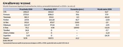 Na polskim rynku bukmacherskim karty rozdaje dwóch graczy. Największy jest STS, należący do rodziny Juroszków, znanej też z deweloperskiego Atalu. Operator odpowiadał za 47 proc. przychodów legalnej branży i rok do roku urósł o ponad 70 proc. Ile zarobił na czysto, jeszcze nie wiadomo, bo sprawozdanie finansowe spółki za 2018 r. nie jest jeszcze dostępne w elektronicznym KRS, a w tym tygodniu spółka nie odpowiedziała na nasze pytania w sprawie tych danych.