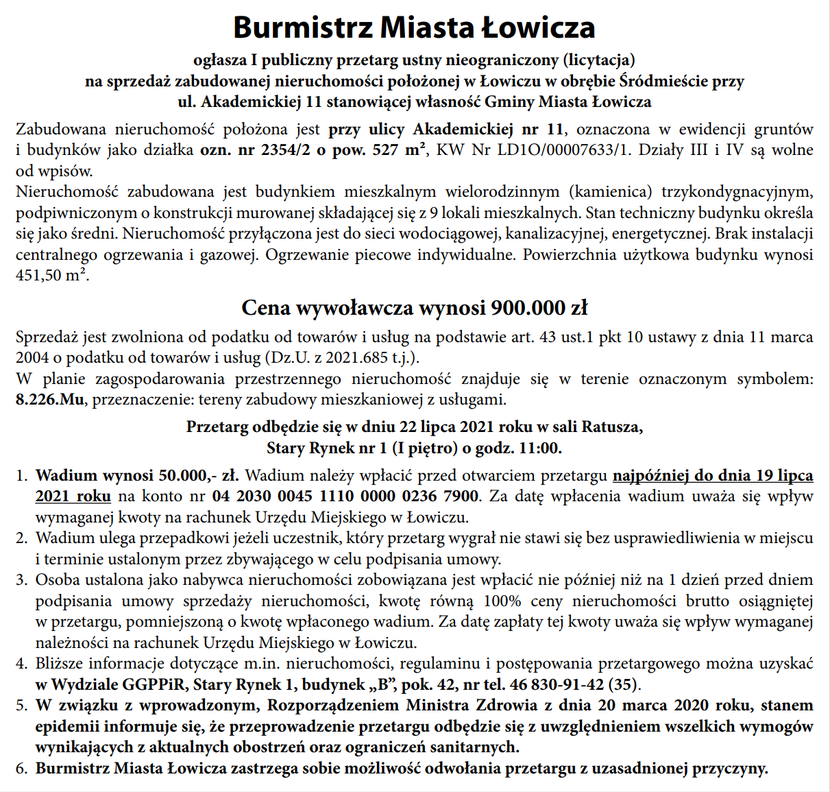 Burmistrz Miasta Łowicza ogłasza I publiczny przetarg ustny nieograniczony (licytacja) Komunikat partneraopublikowano: 2021-05-10 14:19