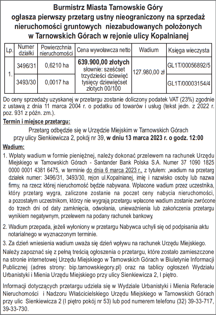 Burmistrz Miasta Tarnowskie Góry ogłasza pierwszy przetarg ustny nieograniczony na sprzedaż nieruchomości gruntowych niezabudowanych położonych