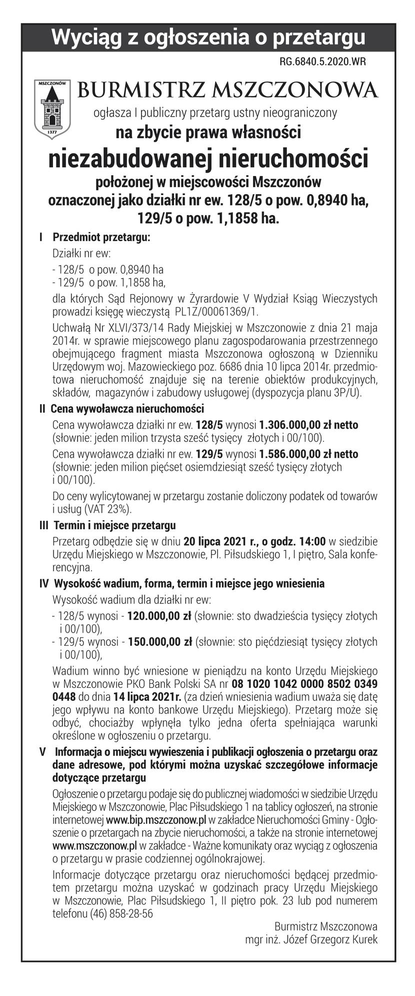 Burmistrz Mszczonowa ogłasza I publiczny przetarg ustny nieograniczony Komunikat partneraopublikowano: 2021-05-11 15:06