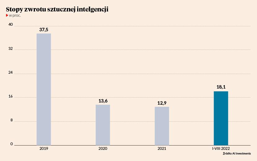 Oprogramowanie gra zarówno na wzrost, jak i spadek wycen aktywów będących w obszarze jego zainteresowania. Zachowuje się więc jak klasyczny fundusz hedgingowy. W pierwszym roku zarobiło ponad 37 proc. W latach 2020-2021 było to kilkanaście procent rocznie. Przegrywało więc z głównymi indeksami giełdowymi. Licząc od początku swojej działalności dogoniło je w 2022 r., gdyż dla sztucznej inteligencji bessy jakby nie było.