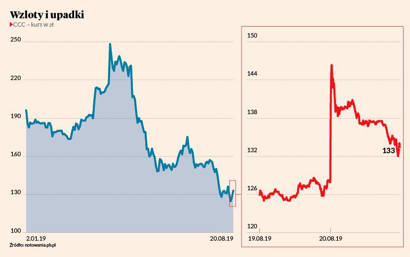 Nawet o 15 proc. do góry szedł w poniedziałek kurs CCC. Ostatecznie skończyło się 4-procentowym wzrostem notowań. Wszystko za sprawą wstępnych wyników za drugi kwartał 2019 r. Zysk operacyjny spadł co prawda o 41 proc. rok do roku, EBITDA obniżyła się o 15 proc., a wynik netto dla akcjonariuszy jednostki dominującej skurczył się o 63 proc., ale rezultaty były lepsze od konsensu prognoz analityków (według PAP Biznes). Przekroczyły go — odpowiednio — o 50, 26 i 32 proc. Zysk na działalności operacyjnej wyniósł w drugim kwartale 159,5 mln zł, EBITDA — 341,9 mln zł. Zysk netto przypisany akcjonariuszom jednostki dominującej to zaś 88,1 mln zł.