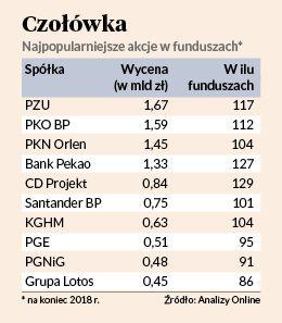 Niemal równie popularne były walory Banku Pekao, obecne w 127 portfelach. Trzecie miejsce zajmowało PZU (117), które górowało nad całą stawką pod względem udziału w aktywach. Walory wyceniane były na 1,67 mld zł. Drugi w tym zestawieniu był PKO BP (1,59 mld zł), a trzeci PKN Orlen (1,45 mld zł). Na koniec 2018 r. wartość polskich akcji w portfelach rodzimych funduszy sięgała 19,6 mld zł. Na dziesięć najchętniej wybieranych spółek przypadała niemal połowa (9,7 mld zł).