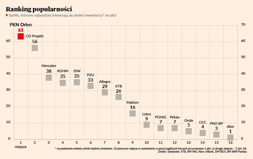 Na to, że drobni inwestorzy zaczynają zmieniać preferencje, wskazywały już dane za czerwiec tego roku. Wówczas CD Projekt tylko o jeden punkt wyprzedził KGHM. Miedziowa spółka uplasowała się w lipcu tuż za podium, na które wrócił Mercator Medical. W szerokiej czołówce pojawił się także debiutant - Onde, nie ma już natomiast gwiazd sprzed roku. Wówczas w szczycie hossy tzw. spółek covidowych ranking wygrywał Biomed Lublin, a dwunaste miejsce zajął 4Mass.