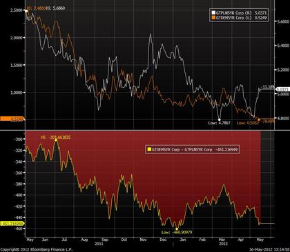 Same polskie obligacje 5-letnie też tanieją. Spread między ich rentownością i rentownością niemieckich papierów przekroczył 450 punktów bazowych.