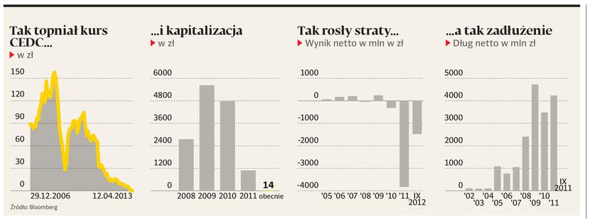 W piątek notowania CEDC spadły na GPW o ponad 40 proc. — mniej więcej tyle procent alkoholu mają flagowe marki największego w Rosji producenta wódek. Desperacja sprzedających była jednak dużo większa, a niektóre transakcje zawierano po 10 groszy. To znaczy, że kapitalizacja spółki, którą w najlepszych czasach wyceniano na grubo ponad 5 mld zł, stopniała do 8 mln zł. Inwestorzy o mocniejszych nerwach wciąż są jednak w grze zwabieni zapowiedzią, że Roust Trading wypłaci wszystkim akcjonariuszom 5 mln USD rekompensaty. To około 0,19 zł na akcję. Rekompensata ma być wypłacona dlatego, że spółka w obecnej formie praktycznie przestanie istnieć — jej akcje zostaną anulowane, a 100 proc. nowych trafi w ręce Roust Trading. Na taką operację zgodzić się musi sąd upadłościowy w USA. Decyzja ma zapaść 13 maja. Pewne jest natomiast, że akcje spółki już nie będą notowane na Nasdaq — w piątek handel został zawieszony, bo CEDC naruszyło kilka punktów regulaminu rynku — nie opublikowało w terminie raportu rocznego, nie zwołało walnego zgromadzenia, a kurs przez dłuższy czas utrzymywał się poniżej 1 USD. Zarząd firmy nie będzie się odwoływał, a jeśli plan reorganizacji zostanie zaakceptowany przez sąd, CEDC pożegna się też z warszawskim parkietem. Kilka tygodni temu spółka musiała się uciec do ochrony przed wierzycielami, bo nie spłacono zapadających w marcu obligacjio wartości 258 mln USD, a mimo dużego poparcia obligatariuszy zabrakło trochę ich głosów, by poprzeć plan naprawczy. To ostatnia szansa na uratowanie bankruta, który kilka lat temu przeinwestował, przy okazji zadłużając się po uszy (dług wynosi 1,4 mld USD). Tymczasem koniunktura na kluczowych rynkach siadła — w Polsce z powodu zmiany upodobań konsumentów, w Rosji po działaniach tamtejszych władz w celu ograniczenia spożycia alkoholu (podwyżka podatków, ograniczenia sprzedaży, reklam i kontrola cen), które zepchnęły handel nim do szarej strefy. Jak przyznał w rozmowie z agencją Bloomberg William Carey, założyciel CEDC, gdyby mógł cofnąć czas, kupiłby w Rosji nie trzy, ale jedną spółkę. Mleko się jednak rozlało, a tak szybko, jak aktywa pojawiły się w księgach spółki, tak szybko dokonywano odpisu ich wartości. Stąd wielomiliardowa strata za 2011 r. i prawdopodobna ogromna strata za poprzedni rok.