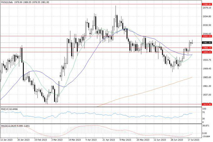 Najwięcej emocji wzbudza wyczekiwanie na komunikaty Fed dotyczące dalszych działań tej instytucji pod kątem polityki monetarnej. Obecnie oczekiwana jest jeszcze jedna, właśnie lipcowa podwyżka stóp procentowych, oraz Najwięcej emocji wzbudza wyczekiwanie na komunikaty Fed dotyczące dalszych działań tej instytucji pod kątem polityki monetarnej. Obecnie oczekiwana jest jeszcze jedna, właśnie lipcowa podwyżka stóp procentowych, oraz najprawdopodobniej brak zmian stóp już do końca bieżącego roku. Ze względu na wciąż niezłą kondycję amerykańskiej gospodarki, na spadki stóp procentowych raczej inwestorzy nie liczą przed 2024 rokiem. Niemniej, rynek już teraz wycenia zapowiedzi gołębiego Fed, co sprzyja wyższym notowaniom złota na przestrzeni kolejnych miesięcy.