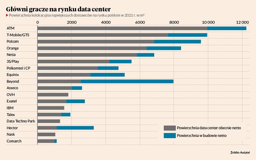 Łączna powierzchnia centrów danych w Polsce pokonała w 2021 r. barierę 100 tys. m kw., a do 2024 r. powinna osiągnąć prawie 144 tys. m kw. – wynika z raportu „Data Center w Polsce – edycja 2022” autorstwa firmy analityczno-doradczej Audytel. Nowe inwestycje w dużym stopniu napędzają światowi gracze rynku chmurowego – Google, Microsoft, AWS. Oprócz obecnych na polskim rynku dotychczasowych operatorów pojawiają się na nim firmy globalne. Obok Equinixa inwestycje rozpoczęły firmy Vantage, EdgeConneX i Data4. Obecnie w Polsce w budowie jest 46 tys. m kw. powierzchni data center.