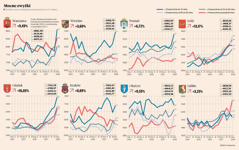 Ceny transakcyjne mieszkań nadal idą w górę. W kwietniu 2018 r. indeks urban.one, przygotowywany przez Cenatorium dla „PB” i Bankier.pl, wyniósł dla dużych miast 97,70 pkt. i był wyższy o 0,87 pkt. niż przed miesiącem. Jeszcze większy wzrost — aż o 2,20 pkt. — zanotowano w porównaniu do kwietnia 2017 r.