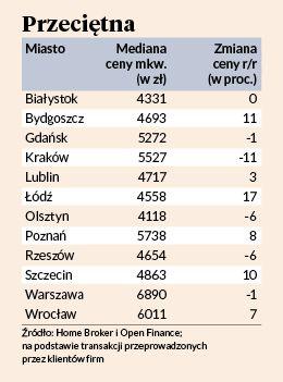 W Warszawie zmiana ceny rok do roku tak czy owak nie jest duża (spadek o 1 proc.), dużo wyraźniejszy spadek mediany zanotowano w Krakowie, gdzie obniżyła się ona o 11 proc., do 5,5 tys. zł za mkw. Drożej niż pod Wawelem jest już we Wrocławiu, a także w Poznaniu. — Wrocław dynamicznie się ostatnio rozwija, obserwujemy tam niskie bezrobocie i wzrost pensji. Przekłada się to na wzmożoną aktywność deweloperów i rosnącą liczbę chętnych na zakup mieszkania — mówi Marcin Krasoń, analityk Home Brokera.