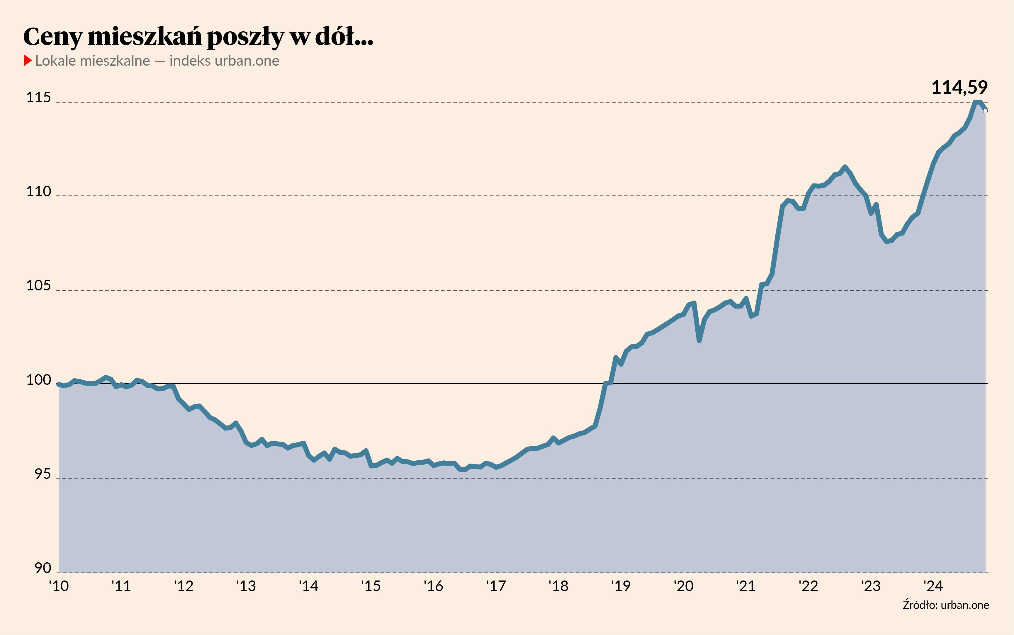 W listopadzie ziściły się wyczekiwane przez kupujących i czasem zapowiadane przez ekspertów obniżki cen mieszkań w aktach notarialnych. Opracowywany przez Cenatorium dla „Pulsu Biznesu” i Bankier.pl ilustrujący te ceny indeks urban.one zmalał w ciągu miesiąca o 0,42 pkt. Wartość indeksu odnoszącego się do lokali mieszkalnych wyniosła w listopadzie 2024 r. 114,59 pkt. To pierwsza taka sytuacja od kwietnia 2023 r.