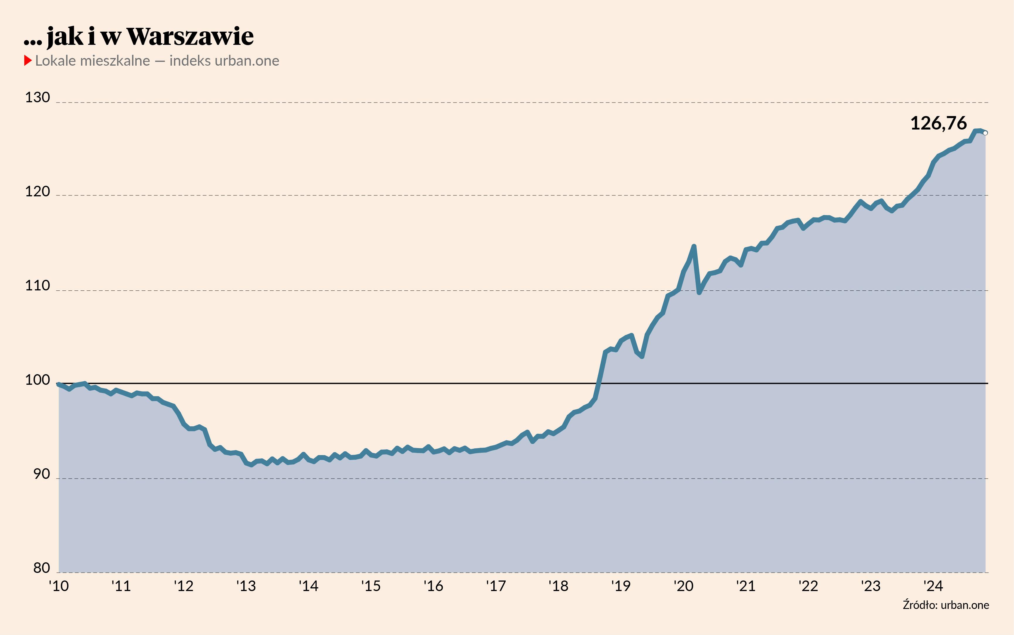 Obniżka na rynku warszawskim była niewiele mniejsza, bo o 0,21 pkt. Wartość indeksu urban.one dla mieszkań w stolicy zatrzymała się na poziomie 126,76 pkt.
