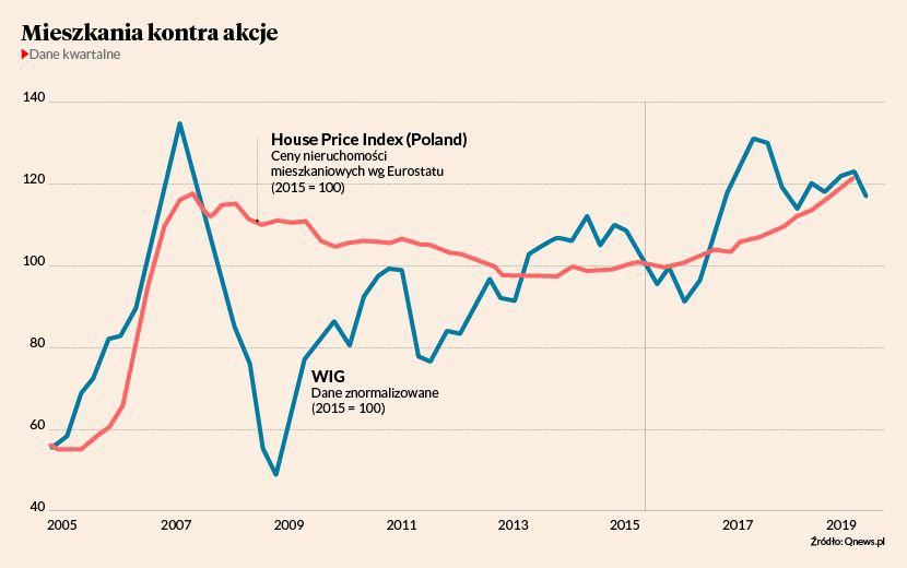 W ostatnich dwóch latach ceny mieszkań w Polsce rosną szybciej niż akcje, ale w dłuższym okresie różnica jest niewielka — zwraca uwagę Tomasz Hońdo, starszy analityk w Quercus TFI. Porównanie indeksów obliczanych dla nieruchomości mieszkaniowych przez Eurostat (dane sięgają 2005 r.) i WIG świadczy o tym, że w ostatnich latach oba aktywa zdrożały, przeciętnie rzecz biorąc, w zbliżonym stopniu. Tomasz Hońdo zaznacza jednak, że akcje cechują się wyższą zmiennością (przy czym zmienność to nie tylko ryzyko straty, lecz również potencjalne możliwości tanich zakupów), a oba aktywa nie są ze sobą wyraźnie skorelowane. To ostatnie sprawia, że portfel złożony zarówno z nieruchomości, jak i akcji może cechować się lepszym stosunkiem zysku do ryzyka niż każde z tych aktywów osobno.