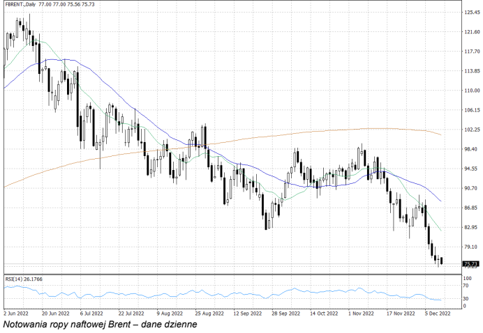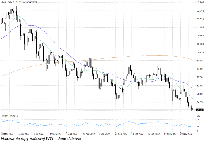 Cena ropy znajduje się nadal pod presją podaży, co wynika przede wszystkim z obaw związanych z globalną recesją i jej negatywnym wpływem na popyt na ropę naftową. Obecnie notowania ropy naftowej poruszają się na najniższych poziomach od roku – cena ropy WTI oscyluje w okolicach 71 USD za baryłkę, a za baryłkę ropy Brent trzeba zapłacić około 76 USD.