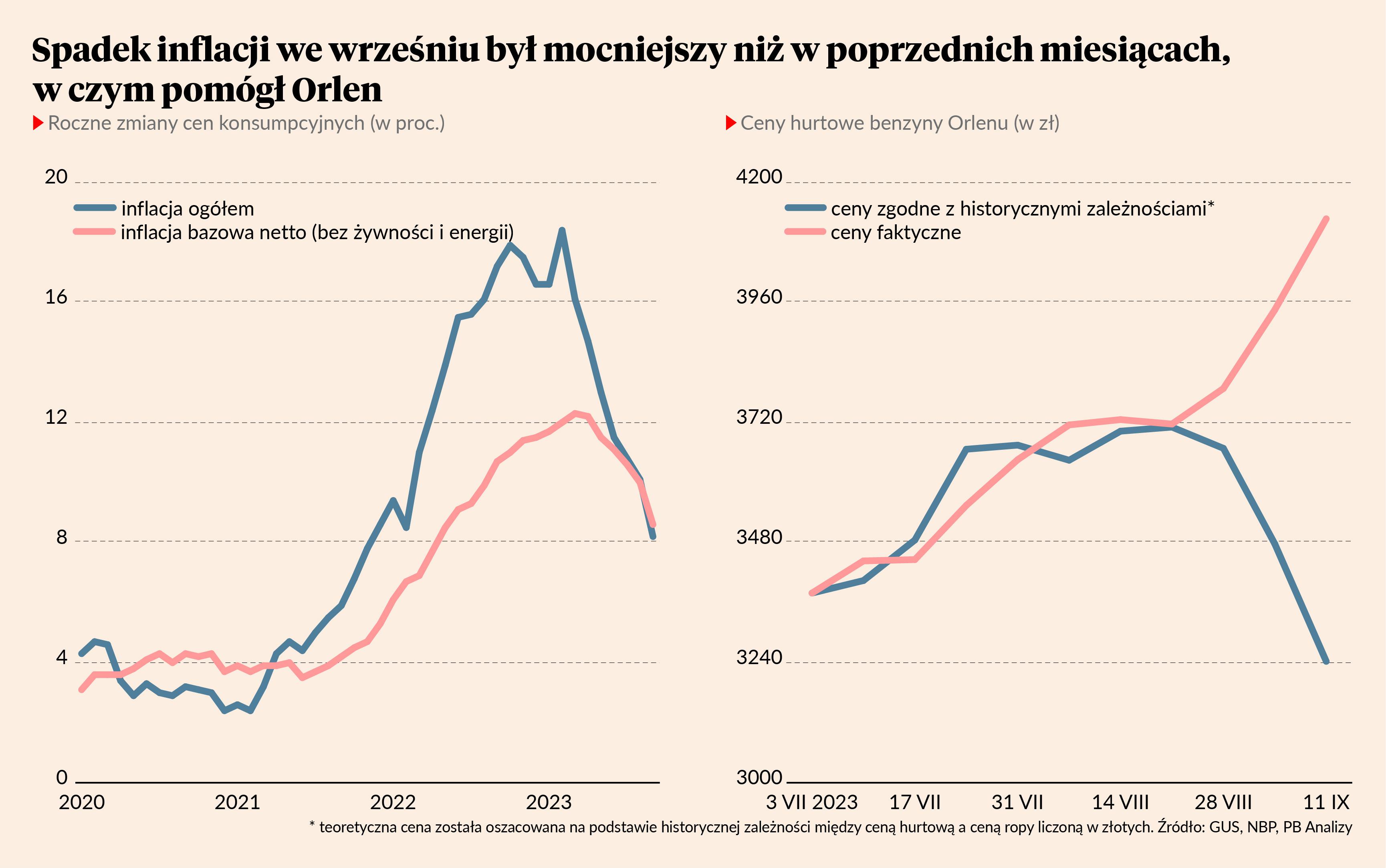 Ewidentnie mieliśmy do czynienia z polityczną ofensywą antyinflacyjną przed wyborami. Jaki był jej wpływ na inflację? Nie da się tego niestety łatwo oszacować. Nie wiemy, jak wyglądałby alternatywny świat. Same ceny paliw w hurcie w Polsce są o 25-30 proc. niższe, niż wskazywały historyczne relacje między nimi a kosztem ropy i kursem dolara. Jeżeli w całości jest to przedwyborcza manipulacja Orlenu, to mogła obniżyć inflację o około 1 pkt proc. Aczkolwiek trzeba pamiętać, że w alternatywnym świecie bardzo wiele elementów byłoby innych, m.in. bank centralny byłby wtedy mniej chętny do mocnej obniżki stóp, a złoty nie osłabiłby się gwałtownie we wrześniu.