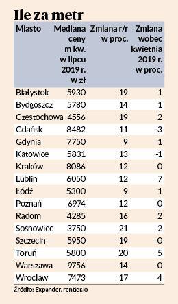 Największą dynamiką mogą się pochwalić Sosnowiec (w którym jest relatywnie najtaniej, bo mediana cen to 3750 zł) i Toruń, w których stawki urosły o 20-21 proc. w ciągu 12 miesięcy. Bliską 20-procentowej dynamikę zaobserwowano także w innych miastach średniej wielkości — Szczecinie, Białymstoku i Częstochowie. Sporo podrożały też mieszkania w Radomiu (o 16 proc.), a względnie najsłabiej wypadły Łódź i Gdynia, gdzie ceny zwyżkowały o mniej niż 10 proc. W porównaniu ze stanem z końca kwietnia tego roku dynamika cen najwyższa była w Lublinie (7 proc.) i Toruniu (5 proc.), obniżyły się natomiast mediany w Gdańsku (o 3 proc.) i Katowicach (1 proc.).