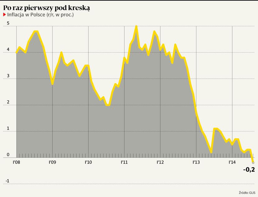Lipiec 2014 r. na stałe wejdzie do historii gospodarczej Polski. Był pierwszym miesiącem od początków transformacji, w którym nasza gospodarka doświadczyła zjawiska zwanego deflacją, czyli spadku cen w sklepach. Jak podał GUS, wskaźnik inflacji spadł w minionym miesiącu z 0,3 do -0,2 proc. Ostatnio ujemną dynamikę cen odnotowano w 1972 r., czyli kiedy jeszcze ceny towarów i usług były centralnie sterowane przez komunistyczny rząd.