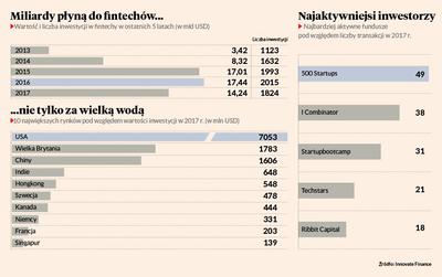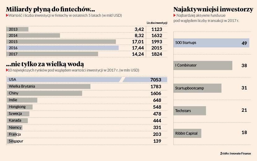Branża finansowych technologii jest dzisiaj jednym z najbardziej gorących rynków inwestycyjnych. Według Innovate Finance, fintechy przyciągnęły 14,2 mld USD inwestycji. To o 18 proc. mniej niż rok wcześniej, ale statystyki zaburzają dwie potężne inwestycje w Chinach z 2016 r., kiedy tylko dwie spółki — JD Finance i Allipay — pozyskały w ramach jednej rundy 1 mld i 4,5 mld USD. W 2017 r. największym rynkiem fintechowym pod względem wartości inwestycji były Stany Zjednoczone, gdzie przeprowadzono 765 transakcji wartych 7 mld USD. Na drugim miejscu znalazła się Wielka Brytania — 1,7 mld USD, wyprzedzając Chiny — 1,6 mld USD. Dalej są Indie — 648 mln USD, Hongkong — 548 mln USD, i Szwecja — 478 mln USD. Na świecie liczba rund inwestycyjnych przekroczyła 1,8 tys. Rekordzistą pod względem wartości pozyskanego kapitału jest SoFi, fintech specjalizujący się w pożyczkach społecznościowych. Na podium znalazła się też jedna europejska spółka — Transfer Wise, operator przelewów międzynarodowych, z estońskimi korzeniami i centralą w Londynie. W 2017 r. inwestorzy wsparli ją 240 mln USD. Transfer Wise jest na liście około 20 (liczba się zmienia) tzw. unicornów, czyli spółek finansowych wycenianych na co najmniej 1 mld zł.