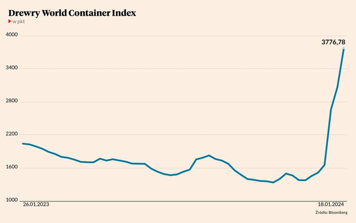 Koszt transportu standardowego kontenera na trasie z Szanghaju do Genui wzrósł w ostatnim tygodniu o 21 proc. do 6,28 tys. USD, wynika z odczytu indeksu Drewry World Container. Od początku roku zwyżka sięgnęła już 126 proc., a cena jest najwyższa od pandemii w 2021 r. Zwyżka nie ominęła też innych tras, a rekordzistką jest Szanghaj – Rotterdam, dla której stawka podskoczyła o 174 proc. w ciągu ostatnich trzech tygodni. Średnia globalna stawka wzrosła o ponad 80 proc. do około 3,8 tys. USD.