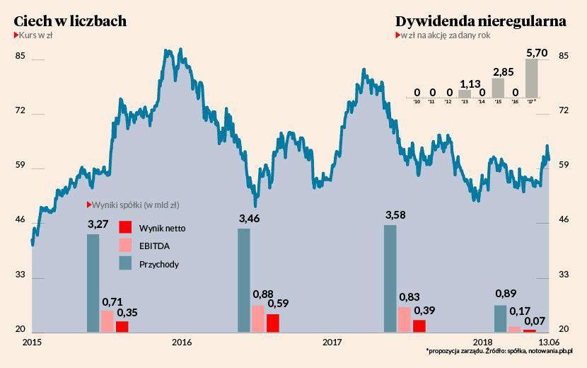 Kilkanaście procent zyskały w trzy tygodnie akcje Ciechu. Powodem była dywidenda za 2017 r. Najpierw zarząd rekomendował wypłatę 5,70 zł za akcję, co wobec kursu zamknięcia z dnia ogłoszenia tej informacji dawało stopę dywidendy 10,4 proc. Dzień później rada nadzorcza podbiła stawkę do 7,50 zł.