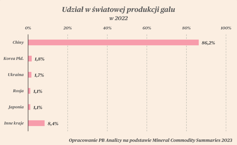 Patrząc na samą produkcję, jej koncentracja w Państwie Środka jest gigantyczna. W przypadku galu Chiny posiadały w 2022 roku 86 proc. zdolności wytwórczych, a w produkcji germanu 70 proc.