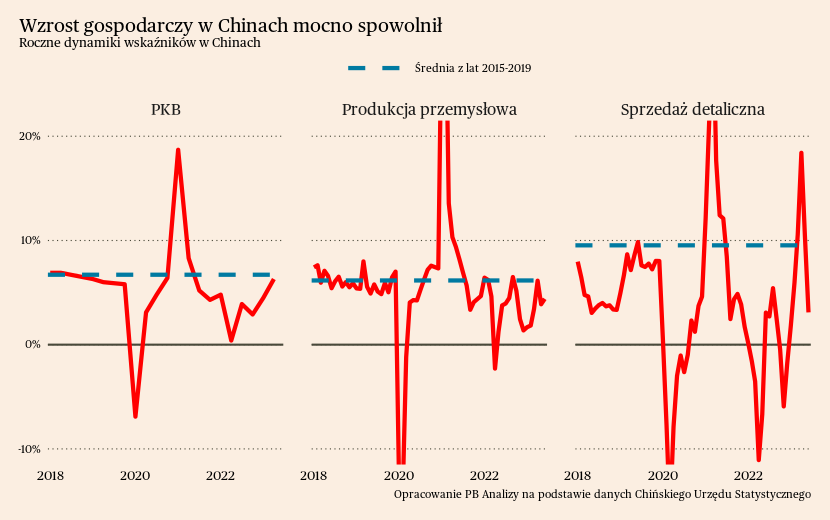 W drugim kwartale 2023 roku wzrost gospodarczy w Chinach był znacznie słabszy od oczekiwań. Roczna dynamika wzrostu PKB wyniosła wprawdzie 6,3 proc., ale wynikało to w dużej mierze z efektu niskiej bazy. W 2022 roku szczyt obostrzeń przypadał na kwiecień i maj. W ujęciu kwartalnym wzrost wyniósł jedynie 0,8 proc. Gdyby taka stopa wzrostu utrzymała się przez cały rok, to gospodarka urosłaby jedynie o 3,3 proc., znacznie poniżej celu rządu. Słaba koniunktura dotyczy praktycznie wszystkich obszarów aktywności gospodarczej.