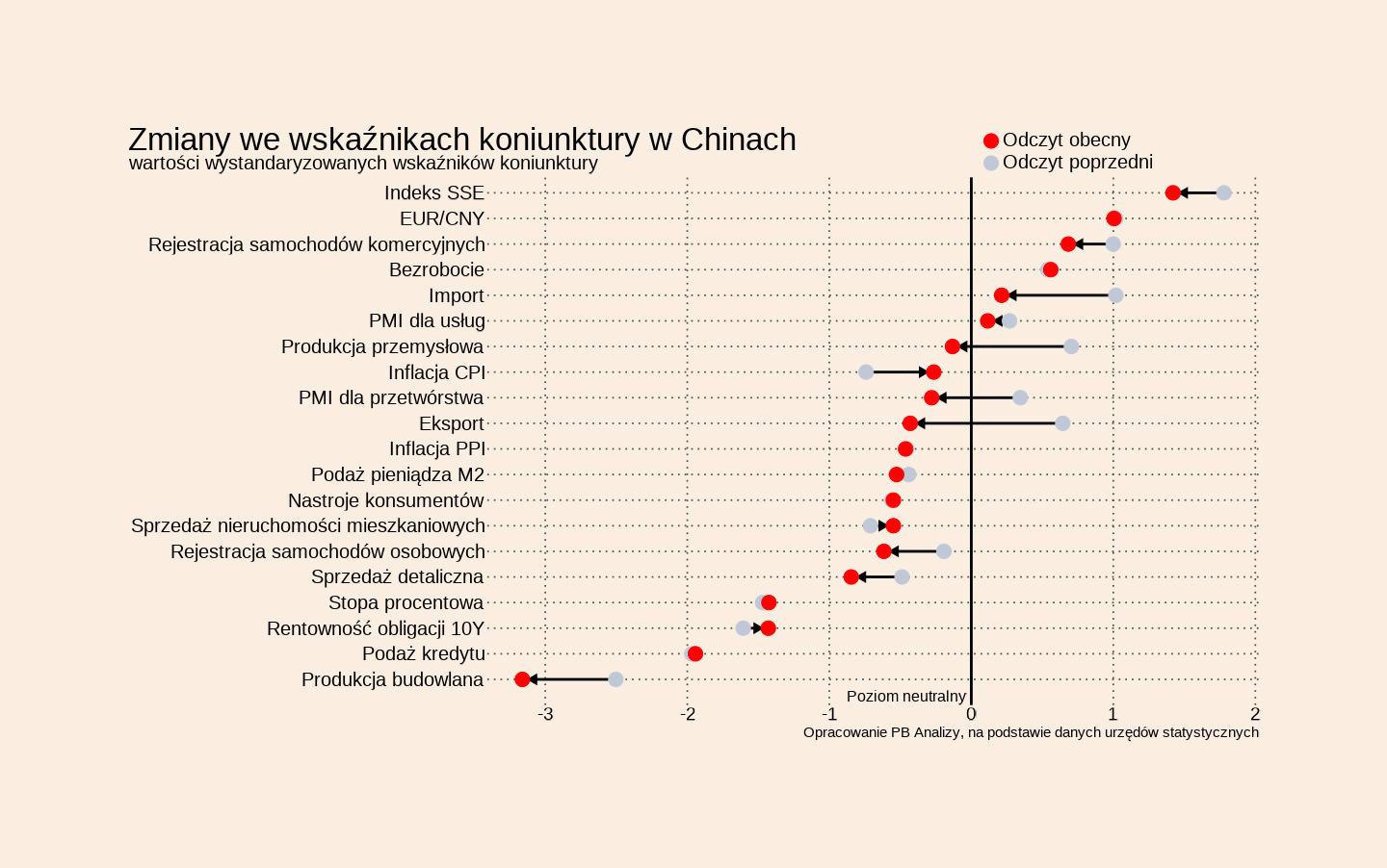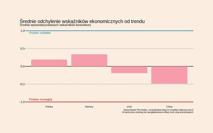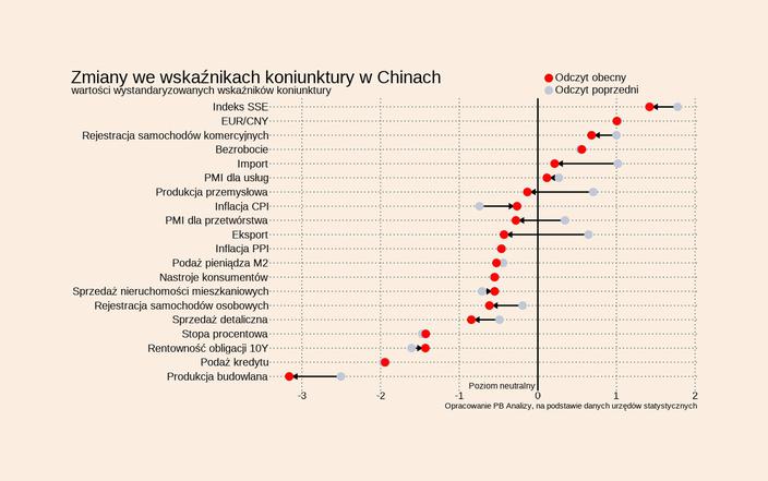Koniunktura w Chinach znajduje się 0,5 poniżej średniej historycznej. Bank Światowy podwyższył prognozę wzrostu dla Chin na ten rok do 4,9 proc. Jednak dane o PKB nie oddają w pełni stanu koniunktury w kraju. Wzrost gospodarczy jest podtrzymany przez stymulację fiskalną, a także wysoki eksport, zwłaszcza do krajów rozwijających się. Hamująco na wzrost wpływa wciąż kryzys na rynku nieruchomości, ostrożność konsumentów i silna presja na marże w firmach. Oprócz danych wspomnianych we wstępie, w ostatnim czasie pojawiły się wskaźniki dotyczące produkcji przemysłowej, sprzedaży mieszkań i bezrobocia.