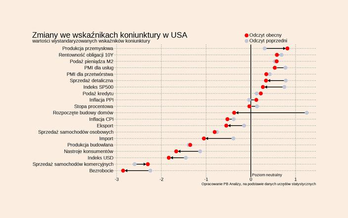 Koniunktura w USA znajduje się 0,2 poniżej średniej z ostatnich pięciu lat. Trudno ocenić, w jakiej kondycji znajduje się aktualnie gospodarka USA, gdyż ze względu na niedawny shutdown część danych nie została opublikowana. Prognozy IMF i OECD wskazują, że PKB urośnie w tym roku o 2 proc. Tymczasem sekretarz skarbu USA Scott Bessent stwierdził ostatnio, że gospodarka USA urośnie w ostatnim kwartale o 3 proc. (kwartał do kwartału w ujęciu zannualizowanym). Jego zdaniem konsumpcja w USA jest bardzo wysoka, a nastroje konsumentów pogorszyły się tylko pod wpływem negatywnego obrazu gospodarki budowanego przez media; w rzeczywistości kondycja konsumentów ma być lepsza niż wynika z badań. W ostatnim czasie pojawiły się dane o inflacji, bezrobociu i kredycie dla sektora prywatnego.