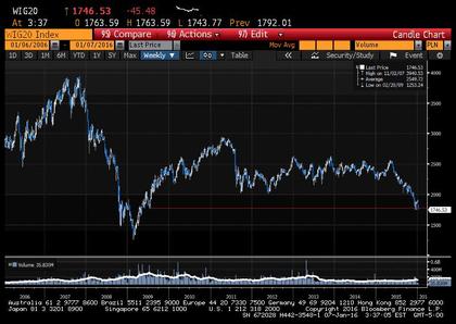 Indeks WIG20 spadł do najniższego poziomu od 2009 r.