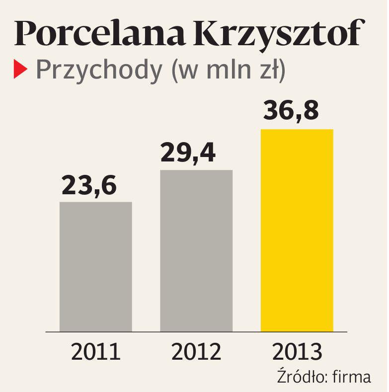— W 2014 r. planujemy 44 mln zł przychodów, ale jest szansa, że przekroczymy ten poziom. Styczniowy wynik był rekordowy. Sprzedaliśmy porcelanę za ponad 4,5 mln zł. To niemal dwukrotnie więcej niż w styczniu 2013 r. — mówi Dorota Serwadczak, prezes Porcelany Krzysztof. Prezes nie ujawnia wyniku netto. Zysk brutto ze sprzedaży wyniósł w 2013 r. 6,2 mln zł.