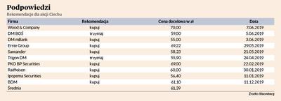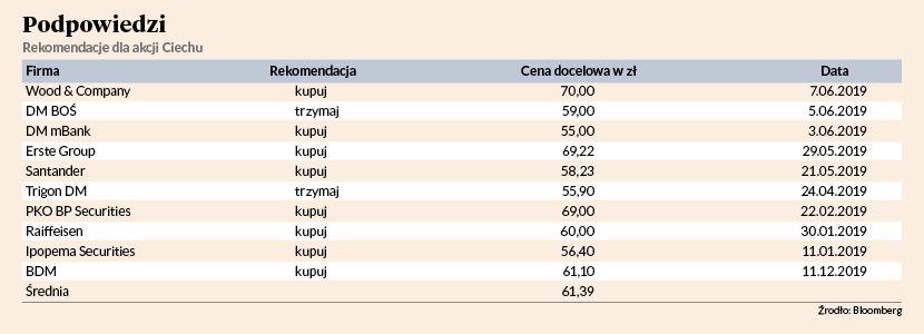 Z dziesięciu ostatnich rekomendacji dla akcji spółki, widniejących w serwisie Bloomberg, aż 8 brzmi „kupuj”, a tylko 2 „trzymaj”. Mało która spółka z indeksu mWIG40 cieszy się takim zainteresowaniem i uznaniem wśród analityków. Można jednak zauważyć pewne ochłodzenie nastrojów, bo jeszcze trzy miesiące temu wszyscy jak jeden mąż rekomendowali nabywanie walorów spółki. Obecnie średnia cena docelowa dla Ciechu wynosi 61,39 zł, co daje około 40-procentowy potencjał wzrostu. Według Jakuba Szkopka przesłanek do poprawy wyników, i to już za drugi kwartał, jest sporo: konsolidacja Proplanu,spadające ceny gazu w Niemczech czy nowe moce produkcyjne sody oczyszczonej uruchomione tam w kwietniu. Jego zdaniem można spodziewać się wzrostu wyników rok do roku już w kolejnym sprawozdaniu. Drugi kwartał będzie więc testem, bo jeśli poprawa nie nastąpi, to przy obecnym sentymencie rynkowym notowania mogą zanurkować. Zwłaszcza że rynek wydaje się niepokoić faktem braku dywidendy w tym roku, co zarząd ogłosił w maju.
