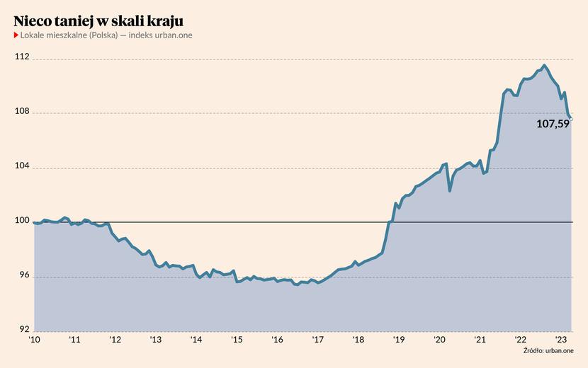 W kwietniu 2023 r. ceny transakcyjne mieszkań po raz kolejny spadły. Indeks urban.one, opracowywany przez Cenatorium dla „Pulsu Biznesu” i Bankier.pl, obniżył się w porównaniu do marca o 0,38 pkt i osiągnął 107,59 pkt.